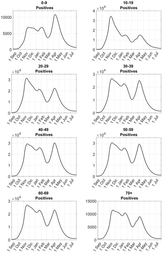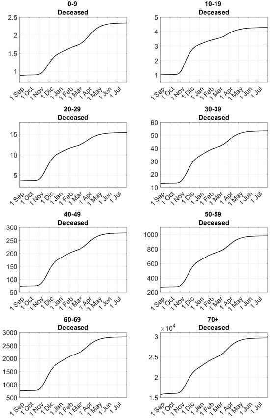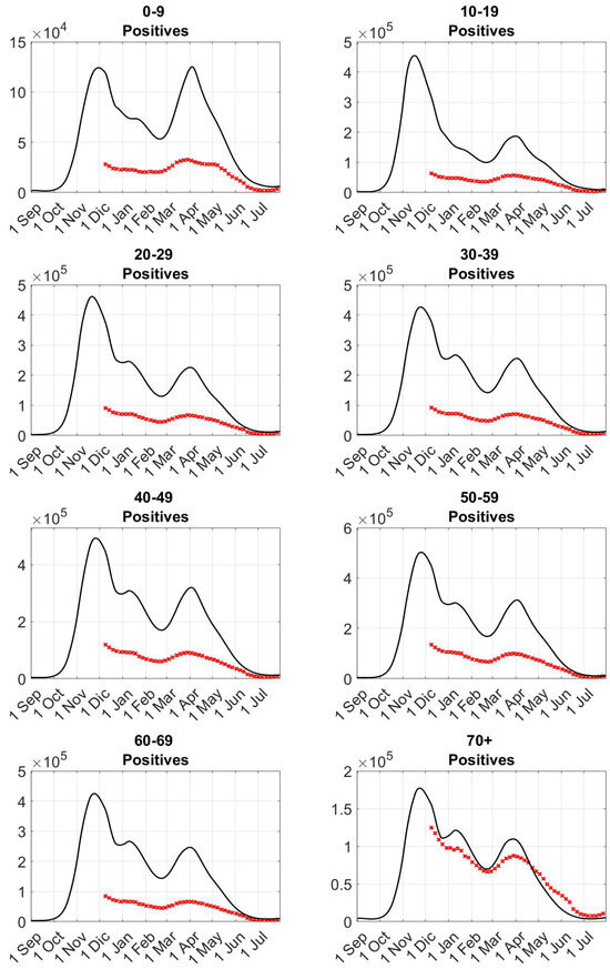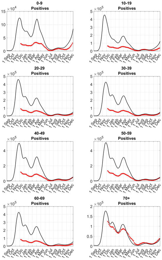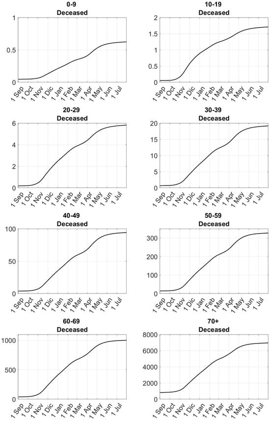 In Figure 18, we observe that even in this case, deceased individuals match the actual data. The curve of positives in the same figure follows the trend of the positives given by DPC, with the usual gap ascribed to monitoring uncertainty. In Figure 19 and Figure 20, we report deceased individuals and positive individuals divided by age groups.