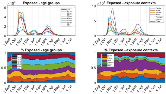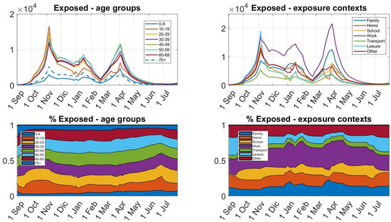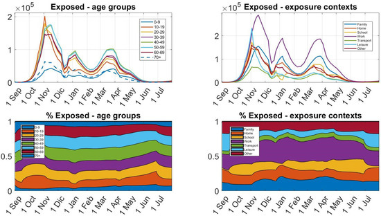 In Figure 24, it is possible to observe differences between the age groups in this last time period. In particular, from the SEIHRDV multi-age/multi-context model, it is possible to see a significant growth in the age groups 0–9 and 10–19, possibly due to the school reopening. In fact, in July and August, schools closed, as shown in the distribution of Exposed in the different contexts of exposure (Figure 25): starting in September, the Exposed in the context “school” started to grow again. In particular, the age groups most affected by school reopening were indeed those aging 0–9 and 10–19 (as can be seen in Figure 25), which are also those less vaccinated (the vaccination campaign concerned those over years old).