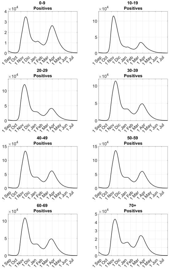 Positives () in Lazio, estimated by the SEIHRDV multi-age/multi-context model divided by age group.