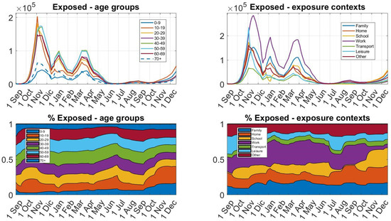 Exposed in Italy with Green Pass containment measures: evolution of the exposed individuals divided by age group (top left) and context of exposition (top right), distribution of age groups (bottom left) and contexts of exposition (bottom right) in the exposed compartment.