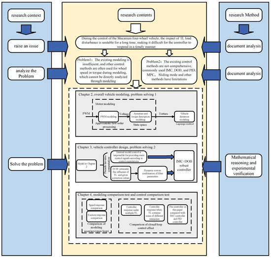 The research methodology employed in this paper is shown in Figure 1. In the introduction, we identified a key problem in existing research: during the period between the initial response and stabilization of load disturbances, most controllers are unable to rapidly correct errors and can only achieve zero-error status once the system has stabilized. A few controllers, such as Model Predictive Control (MPC) or neural network controllers, can quickly correct errors, but they require significant computational resources and are more costly. To address this issue, we conducted an analysis and identified two main causes: First, the existing dynamic models are inadequately considered. In these models, the input is the sum of the output and load torque, making it impossible to isolate the load torque acting on the motor for analysis, thus eliminating the possibility of precise load disturbance control. Second, existing controllers do not promptly adjust the control output (as opposed to the entire system output) when the output is affected by load disturbances.