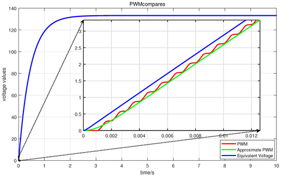 As illustrated in Figure 3, under high-frequency PWM input with a period of 0.001 s and a 50% duty cycle, the PWM waveform closely approximates the behavior of a delayed signal with a time delay of 0.0005 s. The control input is equivalent to the product of the duty cycle and the supply voltage. Based on this characteristic of PWM signals, as well as their inherent saturation nonlinearity—where the input range is constrained between −100 and 100—the relationship between the PWM signal and can be modeled as a delayed nonlinear signal, as expressed in Equation (3):