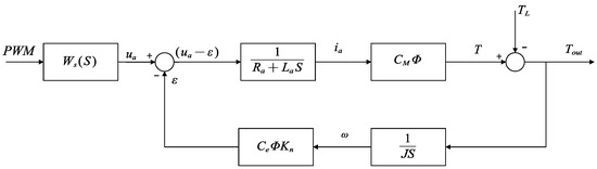 Based on the analysis of PWM waveforms and the mathematical descriptions of the motor armature voltage equation and torque equation, the motor torque is analyzed. The transfer function structure, with input as voltage and load torque and output as motor torque, is shown in Figure 4 [27], where .