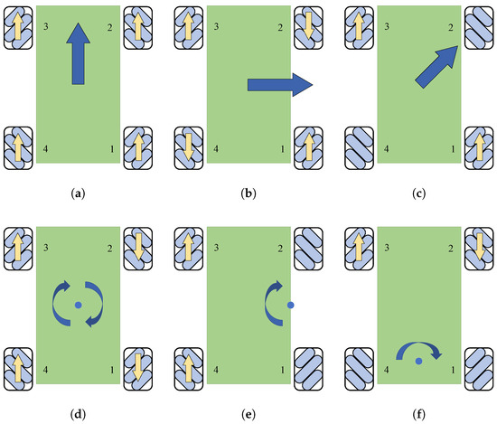 Vehicle movement situation. (a) Forward movement. (b) Lateral movement. (c) Diagonal movement. (d) Body rotation. (e) Longitudinal wheel-based rotation. (f) Lateral wheel-based rotation.