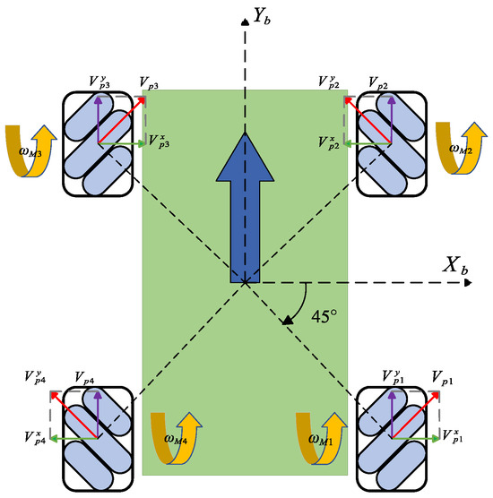 Similarly, when the motor produces a speed , the effective speed can be decomposed along the x- and y-axes of the vehicle’s coordinate system, yielding the velocity components and along the x and y directions, respectively, which drive the wheel to move in the plane. After measurement, it is found that the angle between the wheel and the vehicle body, as well as the angle between the driven wheel and the hub, are both 45°. The relationship between the components of the effective speed and the effective speed itself is shown in Equation (8):