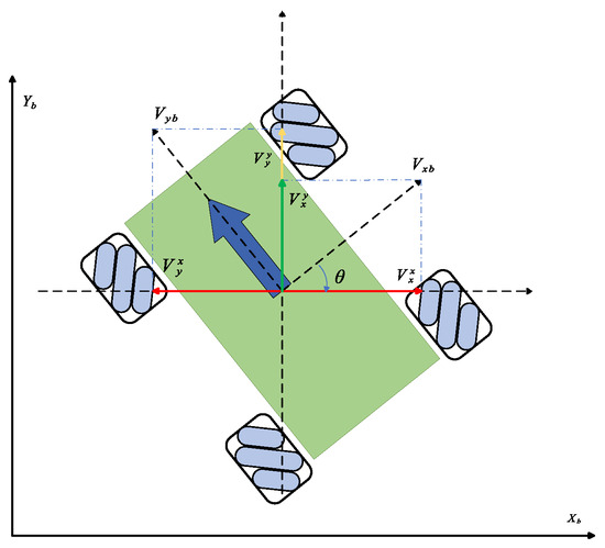 As shown in Figure 7, when the rotational speed of the four wheels is known, the vehicle’s velocities in the x and y directions can be obtained based on the previous decomposition principles, as expressed in Equation (9):