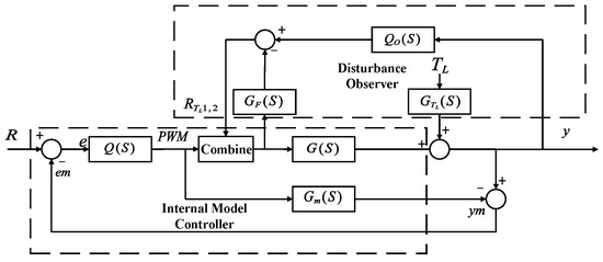 In control system design, the vehicle model has eight input signals, with only four PWM signals being controllable variables. Meanwhile, the load torque , as an external disturbance, significantly influences the system’s dynamic response. As a result, relying solely on traditional control methods like the Internal Model Controller is insufficient to effectively handle variations in disturbance. The IMC is designed to achieve zero steady-state error control only when the disturbance reaches a steady state; however, its response speed and ability to reject disturbances are limited when changes dynamically. Additionally, newer methods, such as nonlinear controllers based on stochastic resonance effects [30], can increase system bandwidth effectively but may cause pseudo-steady-state issues, negatively impacting tracking accuracy and speed.