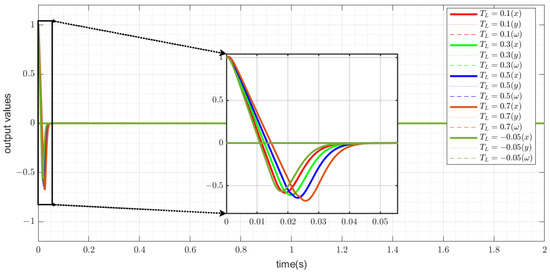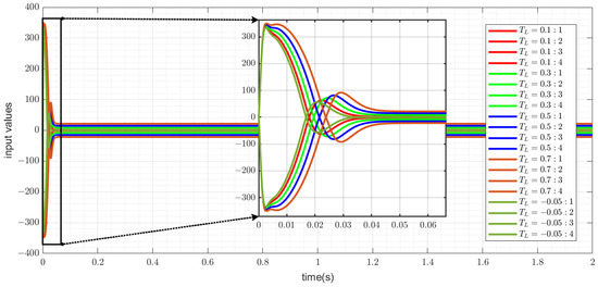 The simulation results in Figure 18 and Figure 19 demonstrate that regardless of the magnitude and direction of the load torque, the IMC + DOB controller can quickly respond to changes in the load torque and converge to the steady-state value at the origin within a short time. Specifically, when the load torque magnitude is small (e.g., ), the system converges in approximately . For larger load torques, such as , the response time slightly increases to , but the system remains stable without significant oscillations. This indicates strong robustness. From the control input graph in Figure 19, the IMC + DOB controller’s input signals exhibit smooth variations without abrupt jumps. Even under larger load torques, the fluctuations in input signals remain within reasonable limits.