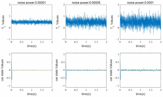 To further verify the robustness of the IMC + DOB controller in complex environments, this experiment focused on testing the system’s performance under Gaussian-distributed noise disturbances. The initial vehicle velocity state was with a fixed load torque disturbance . Noise with power levels of , , and was continuously added to the torque disturbance.