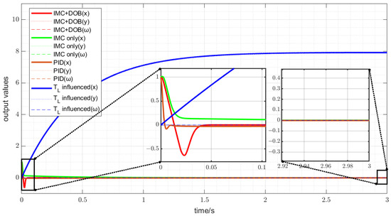 To highlight the real-time disturbance correction capability of the IMC + DOB method, its performance was compared with traditional IMC and PID controllers. The initial vehicle state for all controllers was set to , with a load torque disturbance .