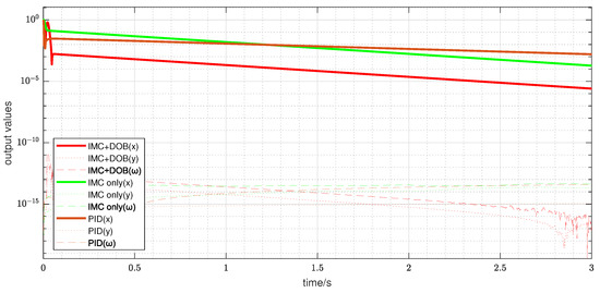 The simulation results in Figure 21 and Figure 22 indicate that the IMC + DOB controller compensates for the effects of and converges to the origin within , even before the disturbance stabilizes. In contrast, the IMC and PID controllers only achieve zero steady-state error control after the disturbance reaches a steady value at approximately . To highlight the differences in control performance, the output is logarithmically transformed, as shown in Figure 23. From the logarithmic plot, considering an error below dB as effectively eliminated, the proposed controller reaches this threshold within 0.05 s, whereas the traditional IMC and PID controllers require 2.1 s and 3.0 s, respectively.