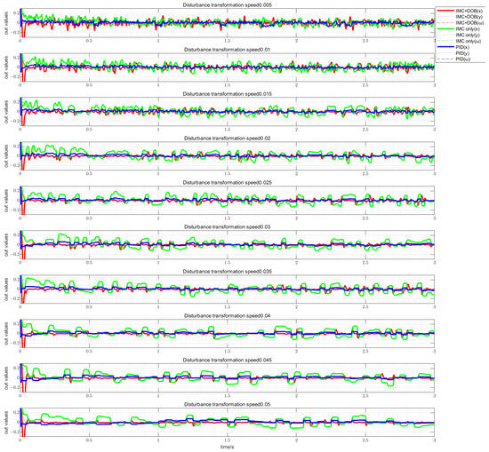 To evaluate the disturbance rejection capability of the IMC + DOB method in handling rapidly varying noise and to compare it with traditional IMC and PID control methods, the following experiment was designed. The initial state of the vehicle was set to , and the load torque disturbance was a random number in the range of . The disturbance variation period increased from 0.005 s to 0.05 s in increments of 0.005 s, resulting in a total of 10 experimental groups. Each experiment was repeated three times. The direct control performance of each controller is shown in Figure 24.