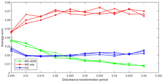 The comparison results in Figure 25 indicate that both IMC + DOB and PID consistently outperform traditional IMC. However, when the frequency of load disturbances is high, the average error of IMC + DOB is relatively larger. Conversely, when the disturbance variation period exceeds 0.025 s, IMC + DOB achieves the smallest average error. This phenomenon can be attributed to the fact that, when responding to sudden load disturbances, IMC + DOB increases the response speed by introducing a certain degree of overshoot, which takes approximately 0.03 s to recover (see Figure 22). Consequently, if the disturbance variation interval is shorter than 0.03 s, the accumulated overshoot effect leads to an increase in the average error. Once the variation interval surpasses this threshold, the rapid convergence characteristic of IMC + DOB enables it to achieve a lower average error compared to traditional IMC and PID control methods.