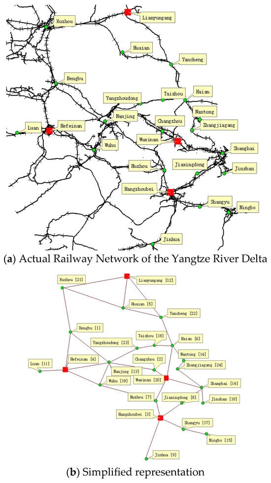 In this example, on the basis of the railway network in Yangtze River Delta of China (Jiangsu Province, Anhui Province, Zhejiang Province, and Shanghai), which is also the most developed area of the petrochemical and fine chemical industry in China. Figure 2 depicts the railway network in the Yangtze River Delta region of China based on ArcGIS data and a simplified topology of the railway network. This network has a total of 32 arcs and 24 railway yards, and from 4 yards we can carry out the Hazmat transferring and marshalling operations. There are 29 O-D pairs in the area corresponding to the yard. Different origins and destinations have differences in the daily delivery of Hazmat containers N(v). Population-related data comes from the 2019 China Urban Statistical Yearbook.