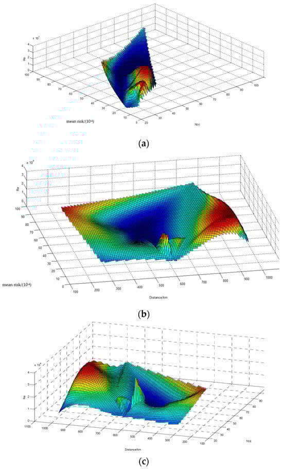 Three-dimensional graph of the correlation between and route distance/average risk/Hazmat number. (a) Correlation among, average risk and Hazmat number; (b) Correlation among, average risk and route distance; (c) Correlation among, route distance and Hazamat number.