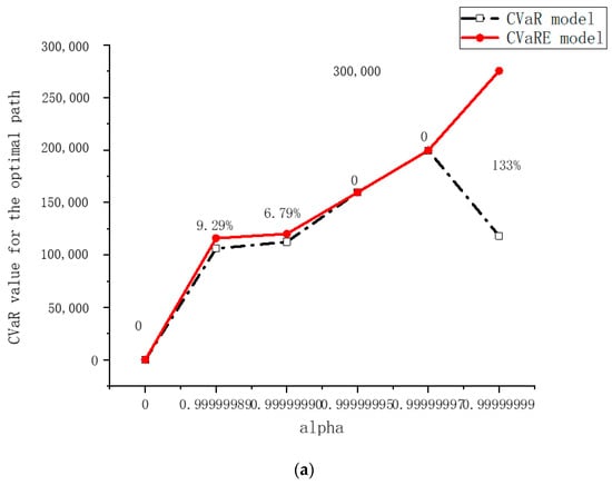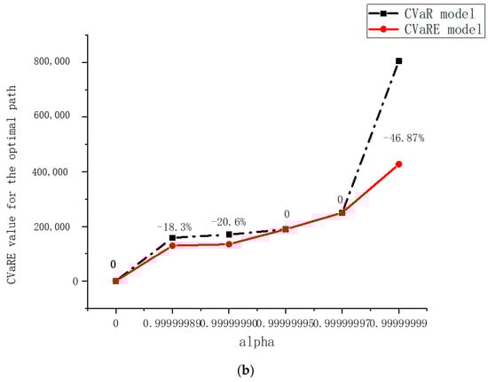 CVaR and CVaRE value for the optimal route of two models in problem P. (a) CVaR value for the optimal path varying with α; (b) CVaRE value for the optimal path varying with α.