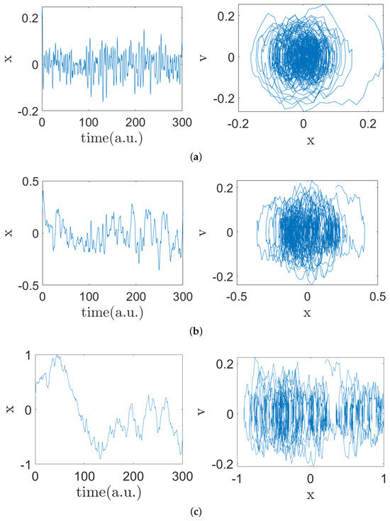 The time series (a.u.) of the Brownian motion variable x obtained with the Ornstein–Uhlenbeck model under a harmonic potential, given by (13), and the solution in state space with for the three cases: (a) overdamped; (b) critically damped; (c) underdamped.