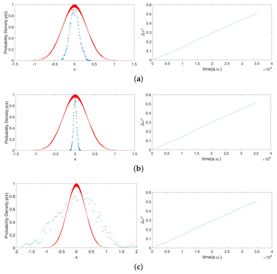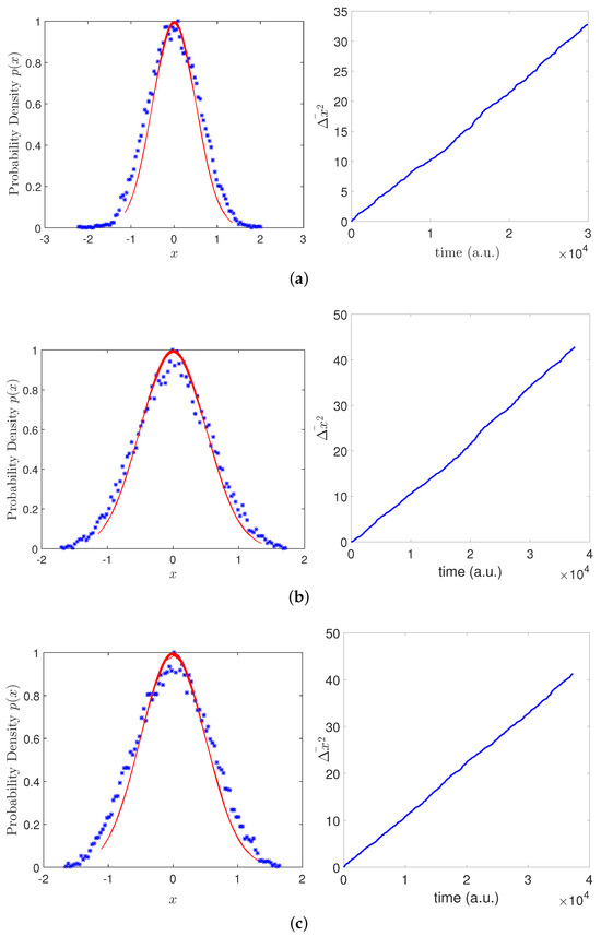 The statistical properties obtained from the system (13). The probability density obtained for the movement is shown using a normalized histogram (blue dotted line), which is compared to the theoretical Gaussian distribution (red dotted line) and the linear growth for the average squared displacement. Data are shown for the three cases: (a) overdamped; (b) critically damped; (c) underdamped.