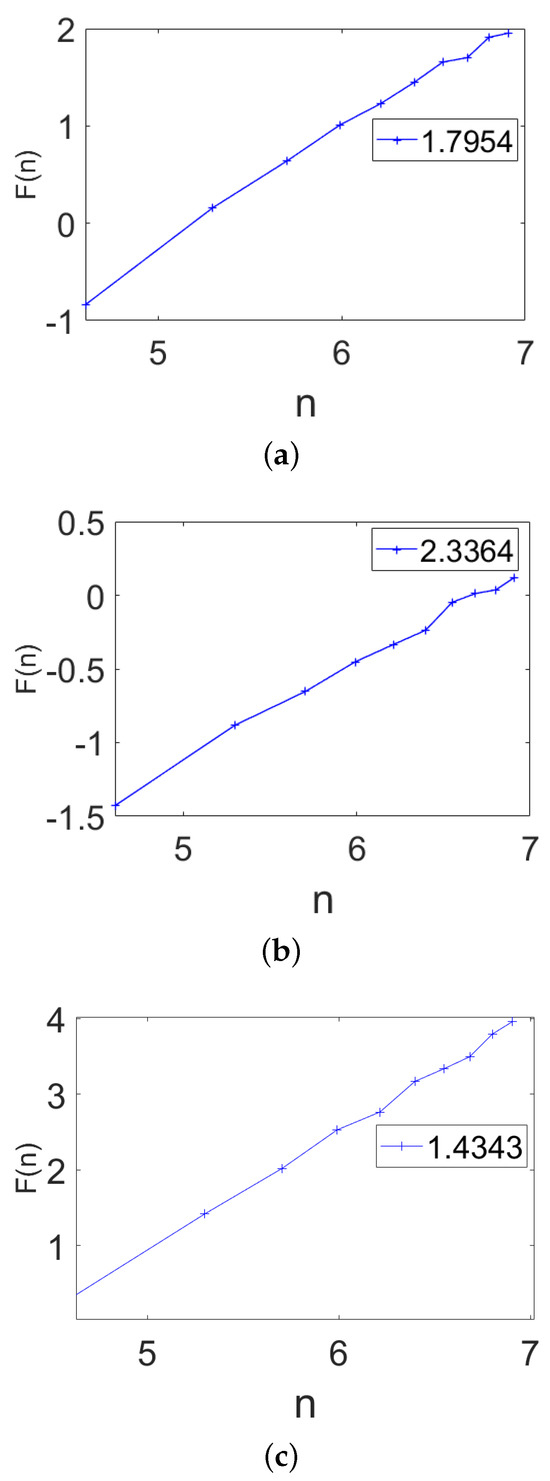 The correlation property of the signals generated by the system (13) is characterized by the detrended fluctuation analysis (DFA) that was developed by Peng [49]. Then, as in the case of a free particle, the DFA technique helps us to guarantee that the proposed system generates Brownian motion, we apply the DFA evaluation method to the time series obtained with the aforementioned parameter values (see Figure 3). The DFA is an important tool for the detection of long-range autocorrelations in non-stationary time series. The DFA is based on random walk theory, which consists of a scaling analysis for which the scaling exponent defines Brownian noise; having mentioned this, with the calculated exponents, we can only guarantee that the underdamped case (Figure 3c) presents correlations of the Brownian type , which is also discussed in Figure 1 and Figure 2. For the overdamped and critically damped cases, it is not possible to describe the type of correlation they present in the series, since values greater than are not characterized in the literature.