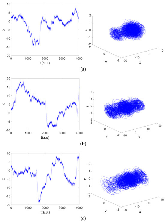 Taking into account the parameter values that were defined in the previous section, the numerical solutions obtained for the three cases are shown in Figure 4 for the (a) overdamped (), (b) critically damped (), and (c) underdamped () cases. Figure 4 shows the time series for the position, and in these images, one can see the characteristic noisy behavior of the Brownian motion as well as the oscillatory behavior associated with the harmonic oscillator. We can also see the solution of the system in the space of states, where it can be seen that the solutions are bounded for velocity and acceleration changes. Furthermore, we can observe that the results obtained are in agreement with the results obtained with stochastic models, in which harmonic behavior prevails over random behavior in the oscillations [48], i.e., in our case, random behavior predominates over harmonic.