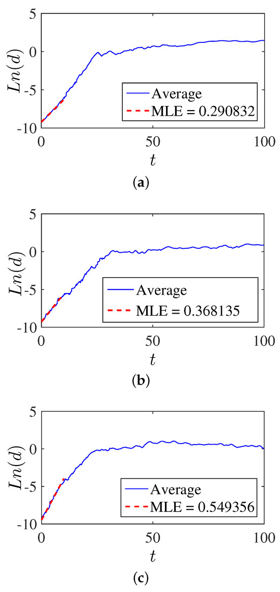 In Figure 6 the maximum Lyapunov exponent obtained, according to [53], of the proposed system is shown to confirm the divergence of the trajectories of the Brownian motion. The maximum Lyapunov exponents obtained for the proposed system (14) for the three cases are as follows: (a) 0.2908 for the overdamped case, where the divergence is less than that of the other cases; (b) 0.3681 for the critically damped case, where the divergence is between that of the overdamped and underdamped cases; and (c) 0.5493 for the underdamped case, where the divergence is greater than that of the other cases. We can infer that in a bounded space, the underdamped case would be ideal if we want to visit the space faster.