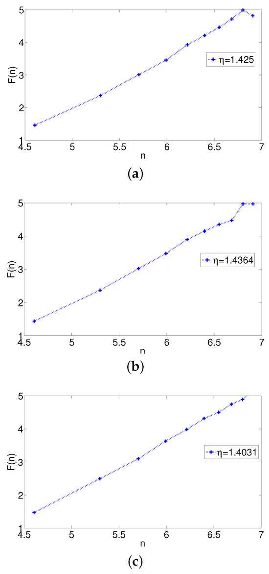 The Brownian motion presents divergence in its trajectories. Now, we are interested in finding the divergence in each ((a) overdamped, (b) critically damped, (c) underdamped). As is known, strong divergence is an essential feature in Brownian motion [52] and can be characterized by a positive Lyapunov exponent, which describes the rate of separation of infinitesimally close trajectories. Quantitatively, two trajectories in phase space with an initial separation vector diverge at a rate given by , called the Lyapunov exponent, and can be calculated as follows: