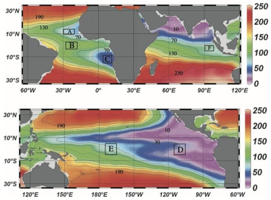 Oxygen Minimum Zones in the Atlantic, Pacific, and eastern equatorial Indian oceans. The oxygen concentration (ranging between 10 and 230 μmol·kg−1) is shown at 400 m depth. Labels A to F mark the areas where additional data on the structure of the vertical oxygen profile are available (see [24] for details); remarkably, all of them demonstrate the tendency of the OMZ to increase in size. Note the large spatial extent of areas with particularly low oxygen concentration, as shown by the deep blue and magenta colours. Adapted from [24].