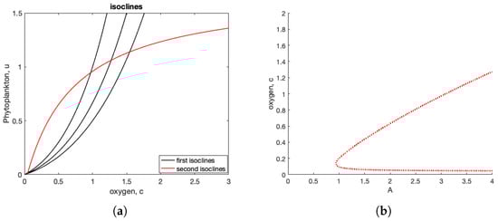 Figure 2. (a) The isoclines of an oxygen–phytoplankton system. The black curve shows the first (oxygen) isocline, and the red curve shows the second (phytoplankton) isoclines obtained for different values of parameter A: from left to right, for , and 4. (b) The values of c in the steady states (bottom value) and (top value) for different values of the parameter A for a fixed value . Other parameters are , , , , and .