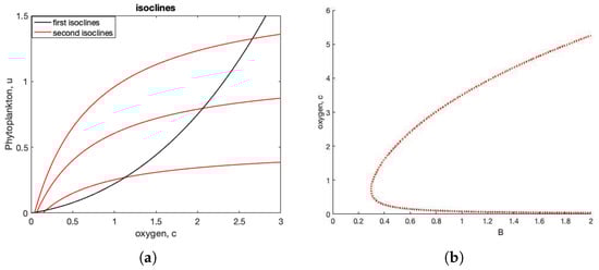 Figure 3. (a) The isoclines of an oxygen–phytoplankton system. The black curve shows the first (oxygen) isocline, and the red curves show the second (phytoplankton) isocline for different values of parameter B: from top to bottom, for , and . (b) The values of c in the steady states (bottom value) and (top value) for different values of the parameter B for a fixed value . Other parameters are , , , , and .