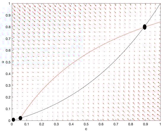 Note that, in order to have a unique solution, system (1) and (2) have to be complemented with the initial conditions, i.e., and . However, here we are not interested in the detailed properties of a specific solution. Instead, for the purposes of this study, we are interested in the solution’s properties in the large-time limit (e.g., the existence of steady states) rather than in details of its transient behaviour at a short and intermediate time. Correspondingly, in order to study the system (1) and (2), we use the technique known as the phase plane analysis [56,57]. Therefore, we now seek to discuss the existence and stability of each steady state for the system. Steady states are defined by the conditions and ; hence, the steady-state values of the oxygen concentration and the phytoplankton density are given by the non-negative (due to the physical meaning of variables c and u) solutions of the following nonlinear algebraic system: