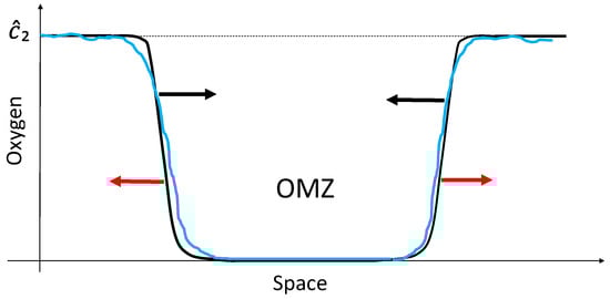 A sketch of the modelling presumptions. The blue curve shows a typical spatial distribution of oxygen across an Oxygen Minimum Zone where the anoxic water inside is separated from well-oxygenated waters outside by the oxycline (a narrow spatial domain of large gradient in the oxygen concentration). The thick black curve shows a typical solution of the reaction–diffusion system (9) and (10). Arrows show possible directions of the travelling wave propagation, which can be different depending on the system’s parameters.