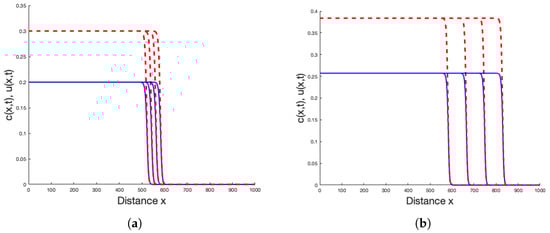 Equations (9) and (10) with initial conditions (11) and (12) were solved numerically by the finite differences method using Matlab® as the coding platform. Figure 6 and Figure 7 show the solution of system (9) and (10) obtained for several different values of A (having other parameters fixed as , , , , , , , and ). We readily observe in Figure 6 that the initial conditions (11) and (12) indeed converge to a travelling front which propagates to the right, i.e., towards the area with low oxygen concentration. Thus, in this case, the OMZ is shrinking. However, by comparing Figure 6a,b, we notice that the speed of the front propagation decreases with decreases in A. It gives a reason to anticipate that a further decrease in A may stop or even reverse the travelling front, and, as we show below, this is indeed the case.