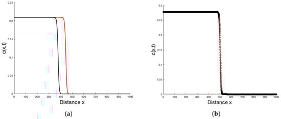 For a broad class of initial conditions, the large-time asymptotic solution of the system (9) and (10) is given by a travelling front connecting the lower steady state on one side of the front to the upper steady state on the other side of the front [46,58,59], i.e., in terms of our model, connecting to . In case the initial conditions are compact (e.g., as given by choosing inside a certain finite spatial domain but keeping outside of the domain), the generic large-time solution of (9) and (10) is given by a set of two travelling fronts emerging, respectively, on both sides of the domain [60,61]; see the thick black curve in Figure 5.