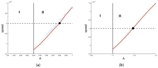 Speed of the travelling front for different values of A obtained for the following: (a) ; (b) . Here, Domain I corresponds to , where the corresponding nonspatial system possesses only the trivial ‘extinction’ steady state but not any positive steady state. Domain II corresponds to the range where, additionally to the trivial equilibrium, the nonspatial system possesses two positive steady states (cf. Figure 2b and Figure 4). The travelling wave solution exists for parameters from Domaion II but does not exist for parameters from Domain I. The large black dot shows the second critical value for which the travelling front changes the direction of its propagation. The OMZ grows for but shrinks for .