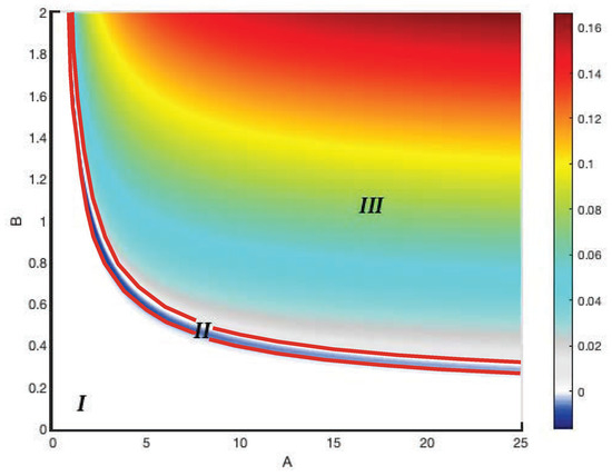 An important question arises here as to what can be the effect of the parameter B on the speed of the travelling front. The results shown in Figure 8 indicate that the observed reverse of the front propagation is not limited to a particular value of B. However, since B is a parameter of high biological significance (i.e., the phytoplankton growth rate), this issue requires a more systematic approach. We, therefore, addressed this question by performing numerous numerical simulations, varying parameters A and B over a sufficiently broad, representative range. The results are shown in Figure 9. We observe that the transition of the marine ecosystem from a ‘healthy’, well-oxygenated state (Domain III—large A, large B) to the deadly anoxic state (Domain I—either small A and/or small B) always occurs through a succession of two tipping points (shown by the two thick red curves in Figure 9). The OMZ shrinks in Domain III but grows in Domain II because of the change in the direction of the front propagation.