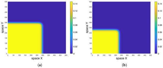 In the conclusion of this section, we mention that the growth and shrinking of the square-shaped initial plankton–oxygen patch (cf. Equations (15) and (16)) follow somewhat different scenarios. In the case of growth (Figure 10), the initial square shape promptly evolves into a round-shaped patch, which can be intuitively expected as the effect of diffusion is stronger in the vicinity of the corners [46,61]. However, in the case of shrinking (Figure 11), and rather counter-intuitively, the near-square shape is preserved at all times, so that the shrinking of the oxygen patch occurs via the propagation of two plane fronts towards the origin, i.e., along axes x and y, respectively.