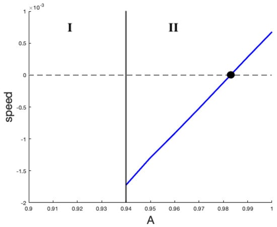 Having performed numerous simulations similar to those shown in Figure 6 and Figure 7 but with different values of the parameter A, we obtain the speed of the front as a function of A; see Figure 8. We, therefore, obtain that, for a succession of decreasing values of A, the system undergoes two critical transitions. For , the system is in a safe, ‘healthy’ state: there exists a stable positive equilibrium (a stable node, see Figure 2b and Figure 4), any initial OMZ (that may emerge as a result of factors not included into our model, e.g., random perturbations such as singular/extreme weather events) will shrink and eventually disappear. When crossing the critical threshold , the spatiotemporal dynamics of the OMZ changes. For , the corresponding nonspatial system still possesses a stable positive equilibrium, but the initial OMZ grows with time, its boundaries (oxyclines) propagating as travelling fronts, eventually resulting in the onset of anoxia over the whole available space. When crossing the other threshold , the dynamics change again. For , the system only possesses a trivial steady state , so that any initial oxygen distribution converges to zero uniformly over the space.