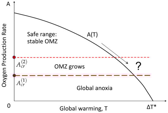 A sketch of the main findings of the paper. The thick black curve shows a hypothetical dependence of the phytoplankton’s net oxygen production rate A on the average water temperature T, which is known to be a decreasing function and can even drop to zero for a sufficiently large increase in the water temperature (roughly estimated as 6 °C, cf. [68]). However, global anoxia may occur for a much smaller temperature increase as soon as crosses the first tipping point . This is preceded by the second tipping point when the OMZ starts growing. The arrow indicates the direction of change. The existing empirical evidence of the OMZ growth seems to suggest (cf. the question mark) that the ocean has already passed the second tipping point.
