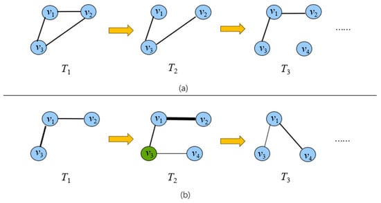 Example of dynamic network evolution. (a) is an example of a dynamic univariate network; (b) is an example of a dynamic multivariate network, where the thickness of the edges represents the weight of the links, with thicker edges indicating higher weight values; the color of the circle represents the attributes of the node.