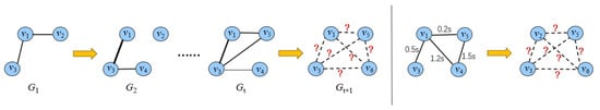 Dynamic Multivariate Networks. As time evolves, both the node set and the link set change, which could be the number of nodes and links, link weights, node attributes, or other features. According to the characteristics of nodes and edges, they can be divided into dynamic unweighted graphs, dynamic weighted graphs, and dynamic attributed graphs. At this point, a dynamic network can be defined as a quintuple , where represents the node set, represents the edge set, represents the edge weight set, represents the node attribute set, and represents the time set. During the evolution of a dynamic network over the time set , the node set , edge set , edge weight set , and node attribute set may all change.