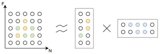 NMF (Non-negative Matrix Factorization), which suits for processing non-negative data, is a classical matrix factorization method. Let represent the adjacency matrix of the network, and the goal of NMF is to find a non-negative base matrix and non-negative coefficient matrix such that . An example of NMF is shown in Figure 3. Ahmed et al. [26] proposed an NMF-based algorithm for link prediction. This method utilizes novel iterative rules to construct matrix factors with important network features and the convergence and correctness of it is proved. Additionally, it demonstrates that the potential NMF features can effectively express the dynamics of the network, thus producing better performance. Ma et al. [27] addressed the relationship between algorithms based on matrix factorization by proving the equivalence between feature decomposition and NMF algorithms, which provides a theoretical basis for designing dynamic link prediction algorithms based on NMF. Based on this equivalence, a new NMF-based algorithm was proposed. This algorithm factorizes each network, uses graph communicability to obtain features, and then folds the feature matrix to predict links. Lei et al. [28] proposed a novel method, called Adaptive Multiple Non-negative Matrix Factorization (AM-NMF), from the perspective of network embedding. In the NMF framework, this method embeds dynamic networks into a low-dimensional space while preserving all features of different snapshots. It also introduces an adaptive parameter to the model, for automatically adjusting the contribution of different terms and effectively fusing hidden information from different time slices. Correspondingly, the inverse process of NMF in the shared space can generate predictions of future network topology. Ma et al. [29] proposed the Graph Regularized Non-negative Matrix Factorization (GrNMF) algorithm to capture the connections between network slices. GrNMF decomposes matrixes related to the network by setting the rest of the network as regularization, for better characterizing the topology of dynamic links. Predictive models based on matrix processing are widely used due to their solid mathematical foundation. For example, the application of matrix analysis methods in support vector machines, principal component analysis, and singular value decomposition has significantly improved the predictive performance of machine learning [27]. However, matrix computations are more susceptible to the increase in network scale, which could lead to a sharp rise in complexity.