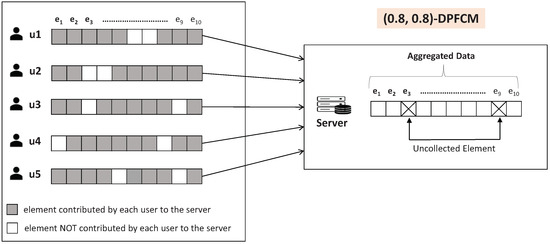 Figure 1 shows an example of -DPFCM applied to a scenario with five users and 10 data elements. This example satisfies the -DPFCM requirements because the set consists of data elements for which at least four users contribute their data to the server, thereby meeting the specified thresholds for both and . We note that by adjusting and , the framework can balance the trade-off between the diversity of data elements and the robustness of user contributions, supporting efficient and utility-driven data collection in real-world applications.