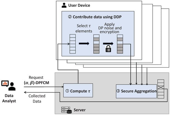 - Computing minimum user contributions: The data collection server calculates the minimum number of data elements, , that each user must contribute to the server to satisfy the requirements of the -DPFCM framework, and then distributes it to all users (Section 5.3).