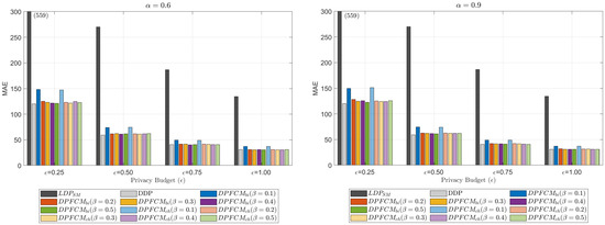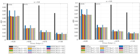Figure 5 and Figure 6 also illustrate the impact of on the data utility of the collected data. As increases, both MAE and JSD show a decreasing trend. This is because a higher ensures that more users contribute to each data element, thereby improving the accuracy in the aggregated results. In particular, there is a significant decrease in both MAE and JSD when is increased from 0.1 to 0.2. Beyond this point, the improvements in MAE and JSD become marginal. This observation confirms that, even with a small value of , which significantly reduces the number of data elements transmitted to the server compared to DDP, the proposed -DPFCM framework achieves performance comparable to that of DDP.