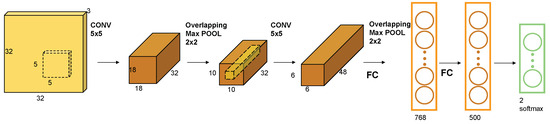 A CNN is a deep neural network with a convolutional structure and is one of the most commonly used models in recent years. A CNN is mainly used for extracting data features and classification [76] with high robustness and fast computational efficiency. The framework of a CNN consists of input, convolutional, pooling, fully connected, and output layers. The convolutional layer uses convolution kernels to perform convolution operations on input data and extract local features. The pooling layer can reduce the spatial dimension of feature maps, thereby enhancing the robustness and generalization ability. The fully connected layer is used for classification or regression, etc. The structure of a CNN is schematically detailed in Figure 3.