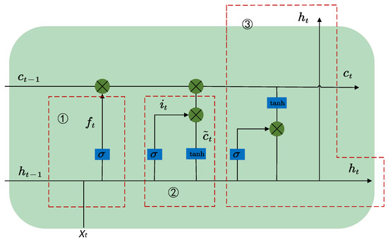 The forget gate is used to decide what information to remove in the cell state, and its structure is shown in the dashed box where ➀ is located in Figure 4. The input and output gate can control the flow of information in and out, and the structure is shown in the dashed box where ➁ and ➂ are located in Figure 4. The three gates can address the issues of gradient vanishing or exploding in RNNs and enable the LSTM to better capture long-term dependencies. Equations (7)–(11) represent a single LSTM. Specifically, LSTM unit status in Figure 4 can be represented by