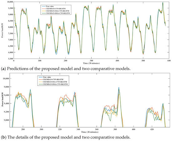 To effectively improve the accuracy of the STLF of power data, in this paper, we propose the CEEMDAN-based improved SSA optimized CNN-BiLSTM (CEEMDAN-ISSA-CNN-BiLSTM) model to systematically solve the above three major challenges—the non-stationarity and low SNR of load power data, the low efficiency of hyperparameters, and insufficient feature recognization in the STLF field—through the three-level “decomposition–optimization–prediction” innovation. Firstly, at the level of data preprocessing, we decompose and reconstruct the power load data into four IMFs using CEEMDAN and sample entropy to improve the signal-to-noise ratio (SNR) for forecasting, which reduces the model confusion and enhances the model interpretability on the data. Secondly, to enhance the performance, avoid prediction bias, and reduce the high computational costs caused by the selection of hyperparameters, we use the improved SSA (ISSA) to select the optimal hyperparameters for enhancing the accuracy of the prediction of CNN-BiLSTM. In the ISSA, three improvements are proposed to avoid the significant prediction bias caused by the stuck local optimums obtained by the SSA in the search and optimization of the hyperparameters of hybrid models: