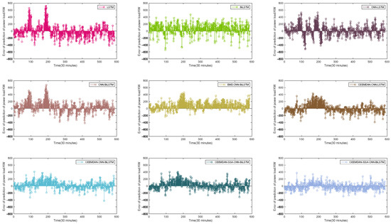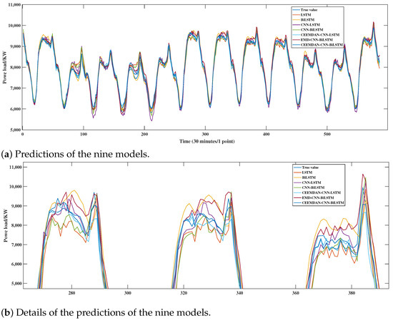 In STLF, deep learning models that integrate signal decomposition algorithms such as EMD, EEMD, VMD, and CEEMDAN have demonstrated multiple advantages. EMD decomposes signals into multiple IMFs iteratively based on their local characteristics. Specifically, EMD operates through sequential extremum detection and envelope construction, initially identifying local extrema within the signal, then employing spline interpolation to generate upper and lower envelopes, from which the mean envelope is derived. The mean signal is subtracted to obtain the residual component. The algorithm iterates recursively until the residual satisfies predetermined termination criteria. As an advanced adaptive decomposition technique, CEEMDAN borrows the idea of adding Gaussian white noise to EEMD by superimposing it several times and extracting the IMF layer by layer through the iterative calculation of residual signals [70]. This method not only ensures the completeness of the decomposition process, but also controls the signal reconstruction error at a negligible level [71]. CEEMDAN effectively alleviates the mode aliasing phenomenon in traditional EMD, and, compared to EEMD and VMD, it achieves significant improvements in computational efficiency and can more thoroughly eliminate residual noise [72].