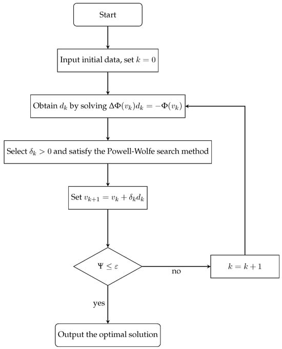 By virtue of Theorem 1 and Lemma 1, Algorithm 1 is well posed. Actually, Equation (5) has a unique solution, which means that step 2 is well posed. Then, from Theorem 2.2.2 in reference [24], it is found that if has a lower bound with respect to , then there exists a that satisfies the Powell–Wolfe step length criterion.