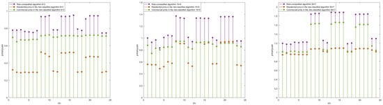 Time-of-use pricing divides a day into multiple periods, such as peak and off-peak periods, and sets different electricity prices for each period to guide users in adjusting their electricity consumption behavior. Fixed pricing, on the other hand, maintains a constant price per unit of electricity regardless of when the user consumes it. We calculate the electricity prices for residential and commercial users under these three pricing mechanisms, as well as the corresponding social welfare. Inspired by Ref. [28], the electricity demand characteristics of different user groups are fully considered, and different price equations are selected. For residential users, we have the following: , , and , which are the FP, peak price, and trough price of TOU, respectively. In the same way, for commercial users, we know that , , and , which are the FP, peak price, and trough price of TOU, respectively. Here, we set and as the largest satisfactory parameters for resident users and commercial users, respectively. , , and are the maximum power consumption, minimum power consumption, and average power consumption of during the period k, respectively, and . The other constant parameters are set as follows: and .